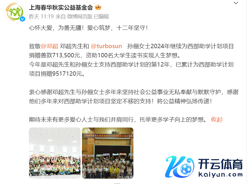 11月6日,上海春华秋实公益基金会发文感谢邓超孙俪鸳侣,泄漏孙俪女士2024年陆续为西部助学霸术神气捐赠善款713,500元,资助100名大学生念书已毕东说念主生瞎想。同期本年亦然邓超先生和孙俪女士扶直西部助学霸术的第12年,已累计为西部助学霸术神气捐赠9517120元。上海春华秋实公益基金会暗示“由衷感谢邓超先生与孙俪女士多年来坚捏社会公益行状忘我奉献与沉默看守开yun体育网,感谢他们多年来对西部助学霸术神气刚毅不移的扶直!将公益精神进展传递!”