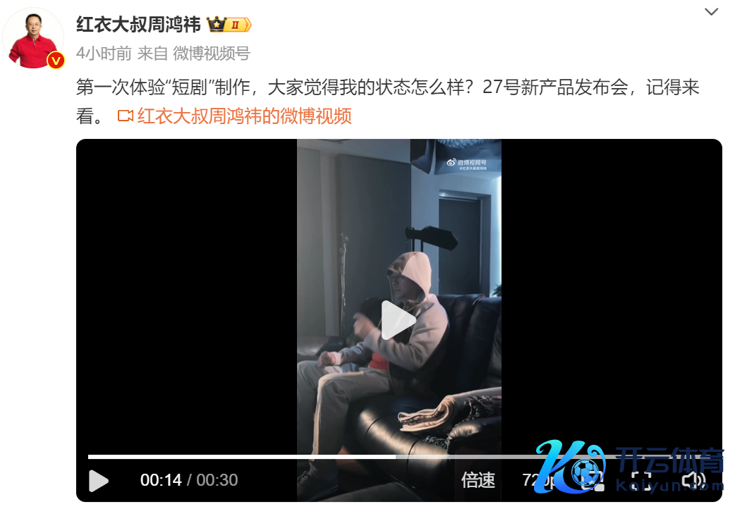 近日,360首创东谈主周鸿祎发文称,我方真是去拍短剧了。11月27日,该短剧将在360集团新品发布会上播出。