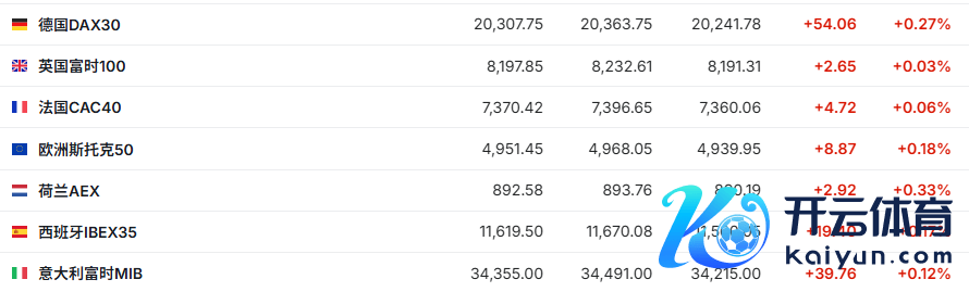 正在来去的欧洲股市大量走高,德国DAX30指数现涨0.27%,英国富时100指数涨0.03%,法国CAC40指数涨0.06%。