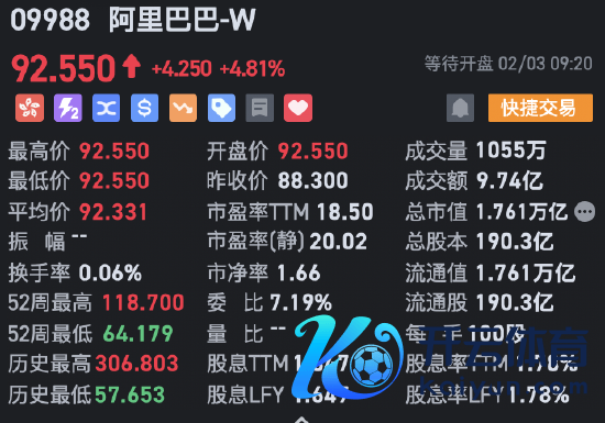 2月3日音问,港股阿里巴巴高开近5%,报92.55港元,成交额9.74亿港元,总市值1.761万亿港元。
