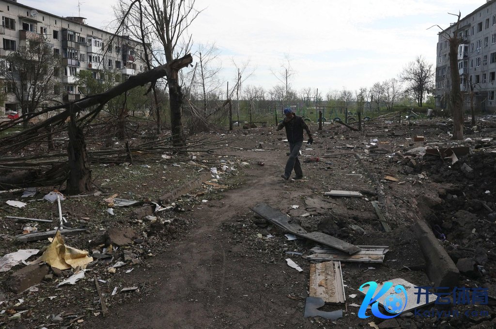 当地时间2024年4月15日,顿涅茨克地区,在阿夫杰耶夫卡镇的墟落,别称当地住户走过被炮火残害的公寓楼。